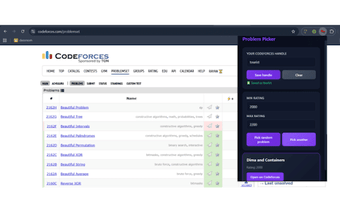CF Problem Picker เป็นส่วนขยายของ Chrome ที่ออกแบบมาเพื่อเพิ่มประสบการณ์การแก้ปัญหาสำหรับผู้ใช้ Codeforces ส่วนเสริมฟรีนี้ช่วยขจัดกระบวนการที่น่าเบื่อในการเลือกปัญหาโดยการเลือกปัญหาที่ยังไม่ได้ลองโดยสุ่มภายในช่วงคะแนนที่ผู้ใช้กำหนด ผู้ใช้เพียงแค่ต้องป้อนชื่อผู้ใช้ Codeforces ของตนเพียงครั้งเดียวเพื่อเริ่มต้น ทำให้การตั้งค่าเป็นเรื่องง่ายและเป็นมิตรกับผู้ใช้